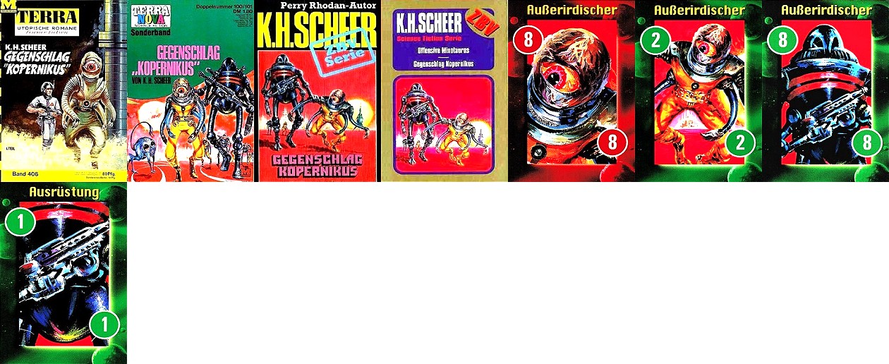 Außerirdischer sehr ähnlich - Bilder für 4 Auflagen des gleichen Romans, 5 bis 8 Ausschnitte aus 3 |