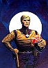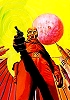 Raumfahrer mit gezogener Handwaffe und kugelförmigem Artefakt |