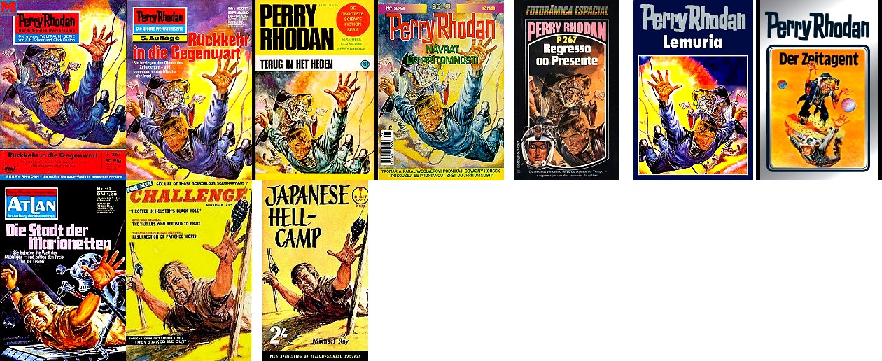 1 - 9 gleiches Bild, teilweise Ausschnitte, da doppelseitiges Titelbild, 8 - 9 seitenverkehrt, weitere ähnliches Motiv, 14 Neuinterpretation für japanische Ausgabe |