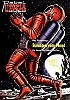 Mann im roten Raumanzug vor Feuer, auf die Seite blickend |