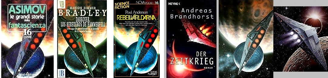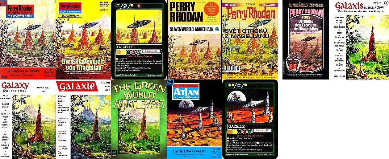 ähnliches Motiv, 1 - 6 gleiches Bild, 7 - 10 gleiches Bild, Vorbild für Landschaft von 1, 11 - 12 gleiches Bild, ähnliche Perspektive wie in 1, aber Raumschiffe durch Felsnadeln ersetzt und der Hintergrund nächtliche Szenerie auf Mond |