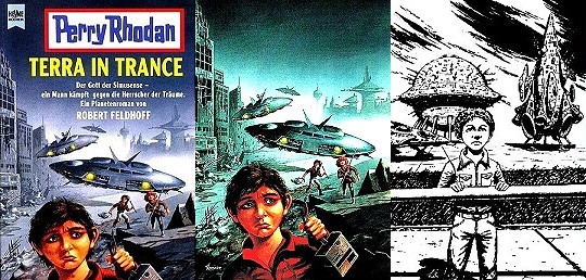 Wüste und Raumschiffe sehr ähnlich, Figuren im Vordergrund unterschiedlich, 1 - 7 gleiches Bild, 4 Aus- schnitt, 8/9 Nachzeichnung für HC-Ausgabe, 10 - 13 gleiches Bild, 13 seitenverkehrt, 15 Vorbild für Nach- zeichnungen |