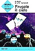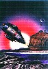 Raketenraumschiff von schräg oben mit sichtbaren Triebwerksdüsen fliegt Richtung Mond bzw. Planet |