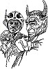 Frau vor doppelköpfigem Mann, der aus Luke steigt |