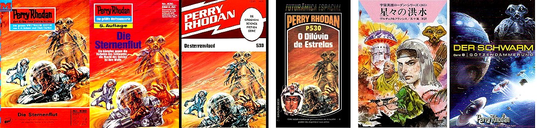 1 - 6 gleiches Bild, 3 in 3D, Hintergrund leicht überarbeitet, 4 seitenverkehrt, in 7 Cynos als Titelbildvignette für Schwarm-Paperback nachgezeichnet |