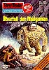Terraner, welcher sich hinter einem Felsen versteckt und einen Stein in der Hand hält, beobachtet einen kastenförmigen Außerirdischen (Malgonen) |
