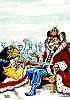 Gruppe von Männern mit Kapuzenumhang vor Außerirdischem |