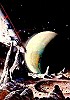 Rakete vor Kugelraumer mit Schutzschirm, im Hintergrund Ringplanet |