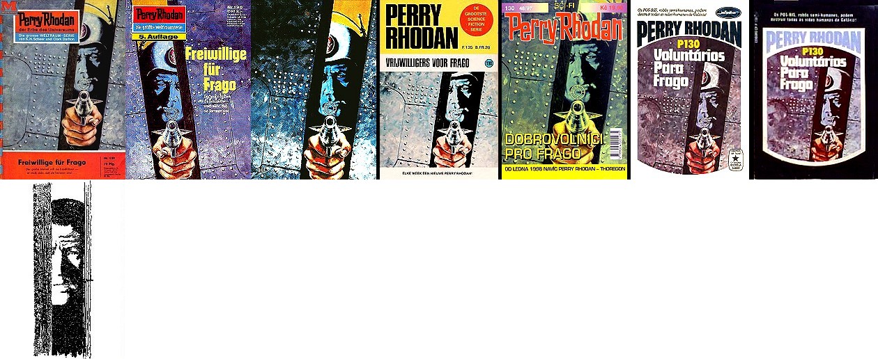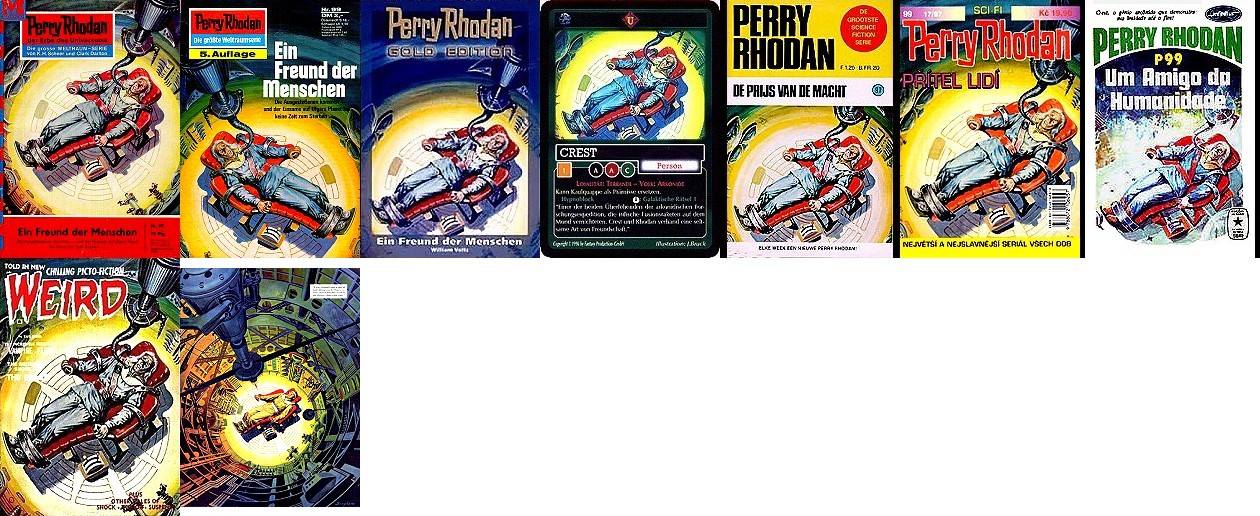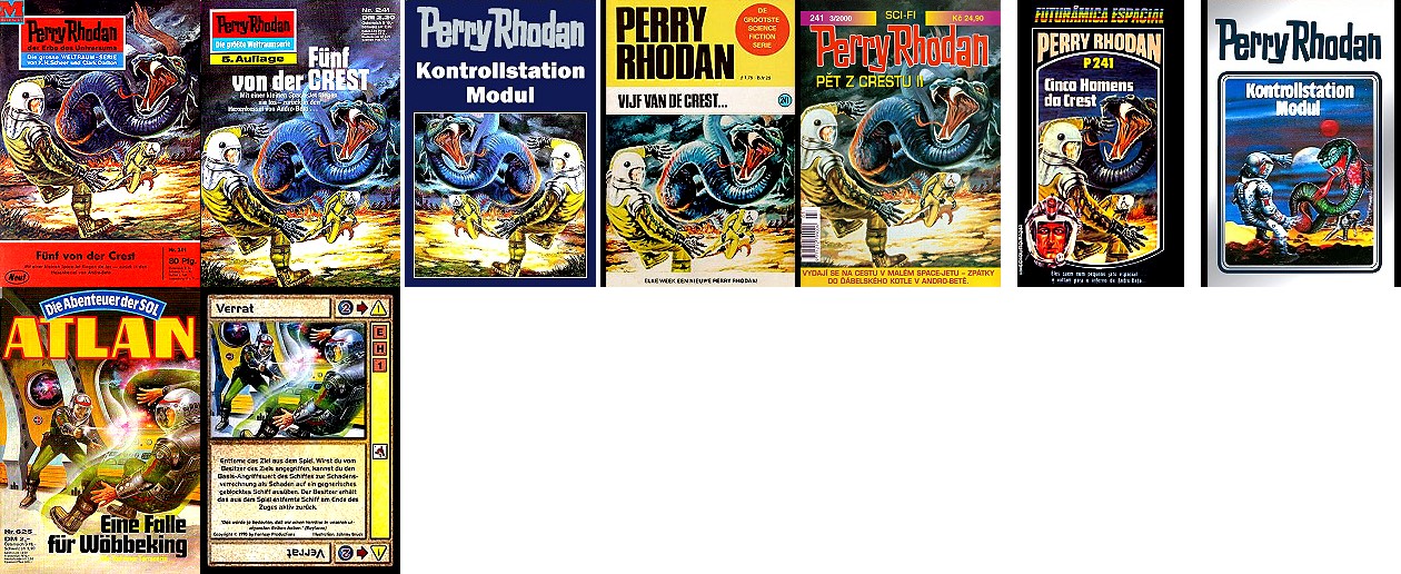1 - 6 gleiches Bild, 3 seitenverkehrt, 6 Schlangenkopf zum Mann versetzt, 7 Nachzeichnung für HC-Aus- gabe, 8 und 9 gleiches Bild, fallender Raumfahrer mit 1 fast identisch |
