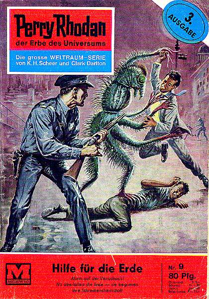 "Hilfe für die Erde" von W.W. Shols 1. Die Titelseite 2. Die letzte Seite mir Werbung 3. Die Beilage in der Heftmitte 4. Einfarbige Beilage vom Perry-Rhodan-Service Diese Beilage ist noch in der Heft-Nr. 95 erschienen.