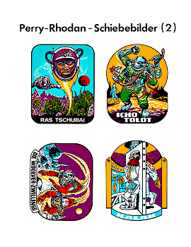 Der ersten vier Perry Rhodan-Schiebebilder (auch Abziehbilder genannt) waren neben dem Perry Rhodan-Abzeichen die allerersten zwei Werbeartikel, welche die Leserschaft erwerben konnten. Diese zwei Jubiläums-Überraschungen wurden im Juli 1965 auf der Rückseite von Jubiläumsheft 200 beworben. Sie waren über den Kundendienst des Moewig-Verlags in München gegen Vorauskasse beziehbar.