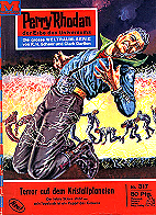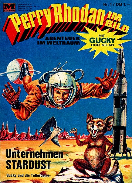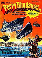 PR-Planeten-Roman Nr. 41, PR-Heft Nr. 52 (2. Auflage) am 24.02.1967, PR-Heft Nr. 317 (1. Auflage) am 29.09.1976, die beiden PR-Comic Nr. 1